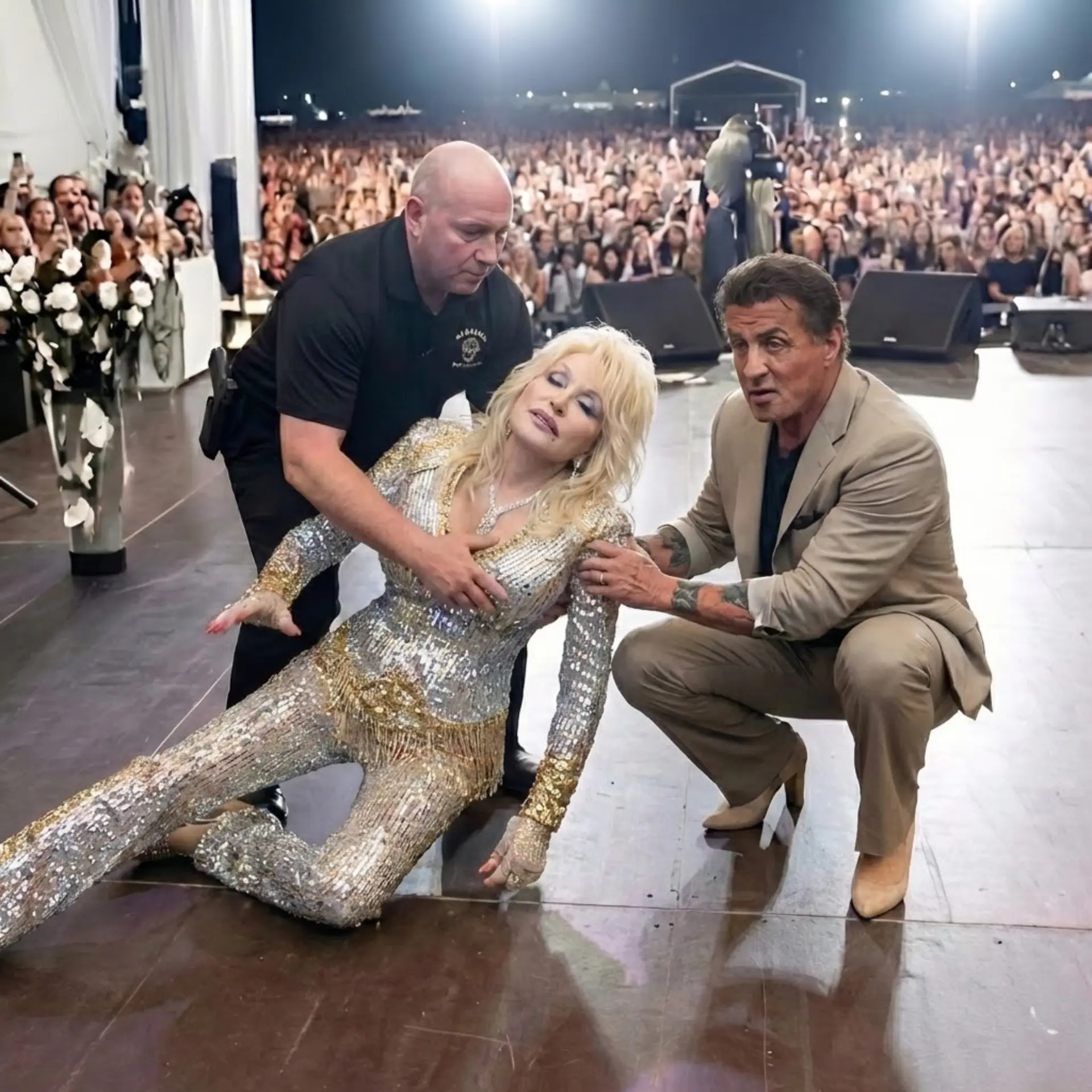 According to people inside the venue, Sylvester Stallone rushed to Dolly’s side, visibly shaken, refusing to leave her as emergency responders worked. The scene unfolded in full view of thousands — raw, unfiltered, and deeply emotional.